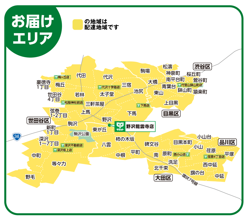 [世田谷区]池尻、梅丘、上馬2・4・5丁目、駒沢2・3丁目、豪徳寺1丁目、三軒茶屋、下馬1・2丁目、世田谷4丁目、太子堂、代沢、代田、弦巻1・2丁目、三宿、若林