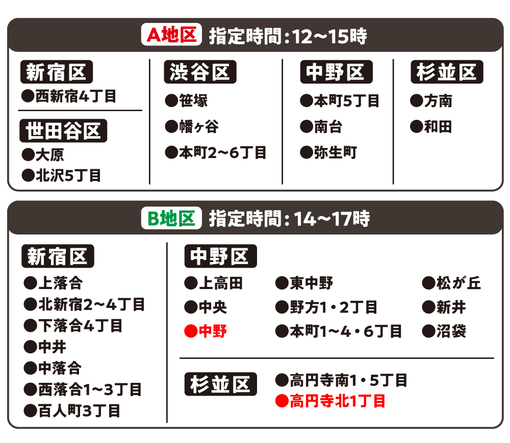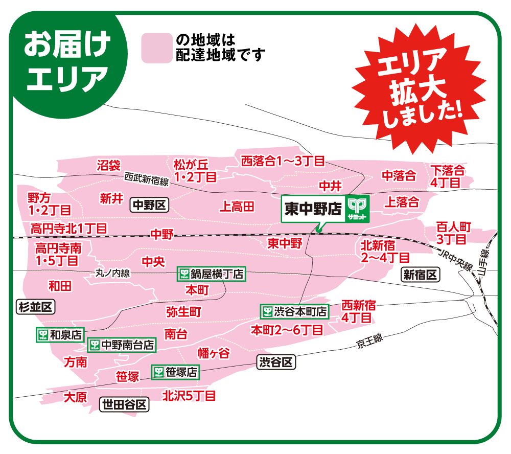 [中野区]上高田、中央、中野、東中野、野方1・2丁目、本町1〜4・6丁目、松が丘、新井、沼袋